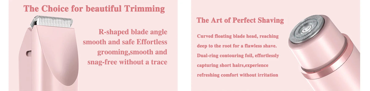 Our pubic hair trimmer for women boasts a 2-in-1 design, featuring both a body shaver head and a facial shaver head in one sleek unit. No need for blade replacements – enjoy hassle-free grooming anytime, anywhere.